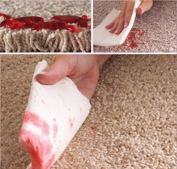 Blot: Always blot; never rub or scrub abrasively, as a fuzzy area may result. When blotting, work from the outer edge in toward the center of the spot to avoid spreading the spill.